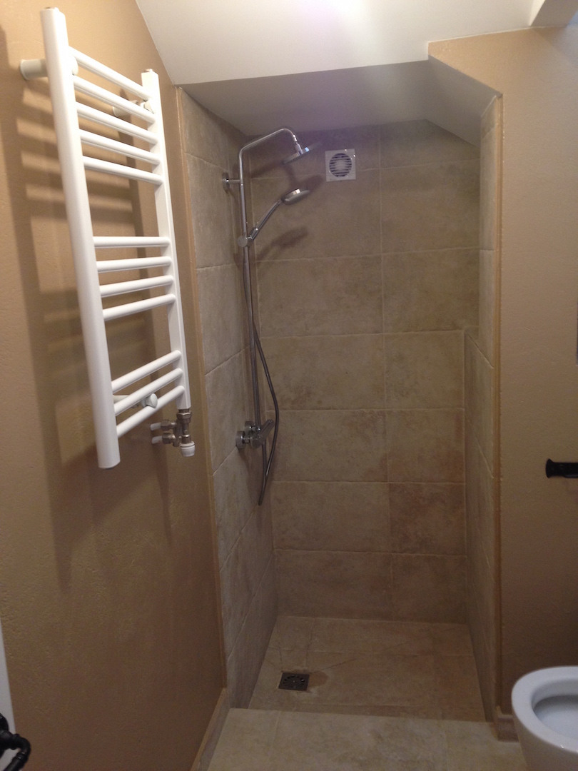 We install non-slip shower trays (Mineral load or Resin) and cover the walls with matching tiles or decorative panels.